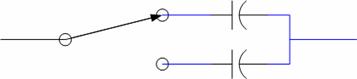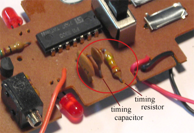 You can also change the value of the timing capacitor. Since I don’t have variable capacitors large enough to work in this circuit, I used a switch to select between 2 different capacitors. The process is the same as for the timing resistor: unsolder the capacitor from the board, solder in 2 wires, and connect the wires to the new capacitor(s). Try a few caps until you find 2 you like, then connect them to a switch so you can select between them. Here’s the schematic: