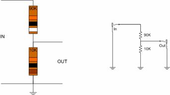 The incoming signal gets soaked up by the 2 resistors in series (100k total); most of it gets soaked up by the first 90k resistor, and about a tenth of it is left over for the 10k resistor... so if you put 2 volts in, and tapped off 10% from the smaller resistor, you'd get about .2 volts out.