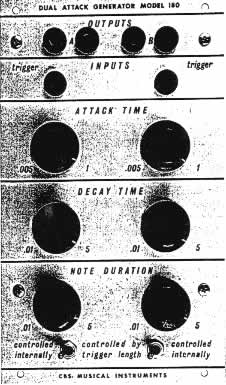 Two independent units produce envelope control voltages initiated by pulses. Attack time is variable from .002 to 1 second; decay time from .002 to 5 seconds; duration from .002 to 5 seconds. Duration may be optionally controlled by trigger pulse length.