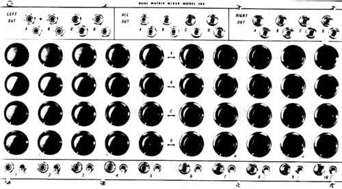 Two 5 in by 4 out mixers with provision for setting the amount of signal coupled from any input to any output. Commoned outputs provide 10 in by 4 out capability. Switches are provided for monitoring input signals through the Model 226 quad monitor/interface.