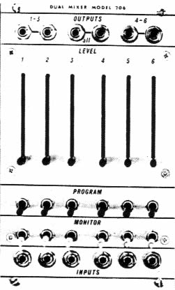 Two 3-channel mixers with separate and common outputs. Each input has associated level control, program switch, and monitor switch.