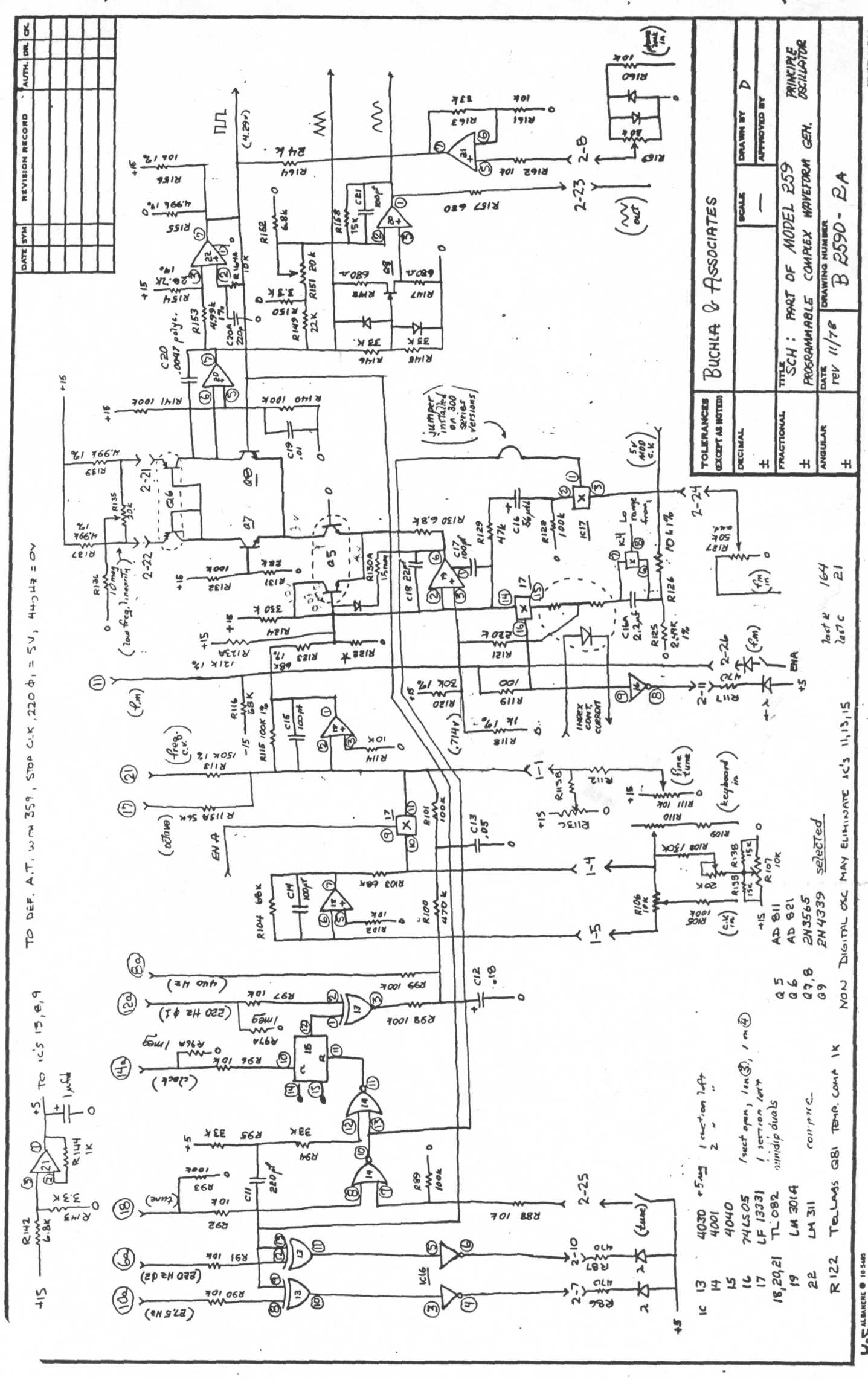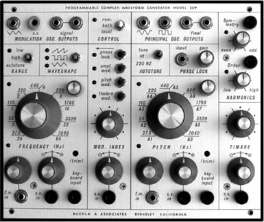 The model 259 Programmable Complex Waveform Generator introduces several innovative techniques for dealing with complex timbres. It features voltage controlled modulation of pitch, amplitude and timbre, multi-dimensional voltage-control of timbre space, phase locking, automatic tuning, and (simultaneous or separate) local (front panel) and remote (digital) control of all functions.