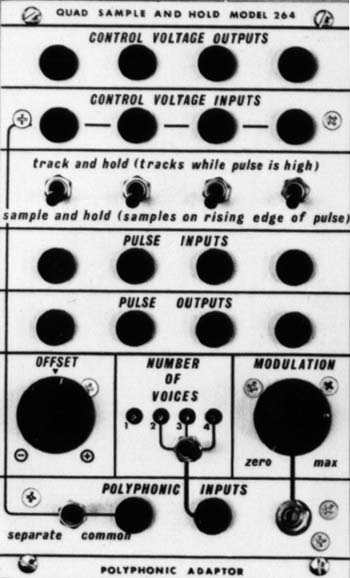 In the sample mode, the value of the input is sampled and applied to the output whenever a pulse is received. The output remains at the value until the next pulse arrives. The track mode differs in that an input is applied to the output for the duration of the pulse. The output tracks the input until the end of the pulse and remains at a constant value until the next pulse. The Model 264 includes a polyphonic adaptor, which performs the logic necessary to implement four-voice polyphony. Facilities are incorporate for fine tuning and f.m. modulation the oscillator; light emitters display the adaptor's operation.