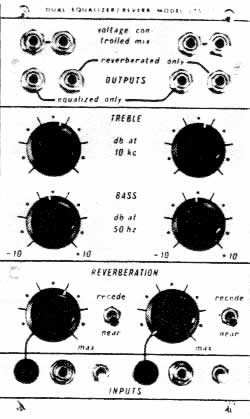 The reverberation electronics and delay elements are remotely mounted. Interconnections are at line level, permitting the use of the control module with reverb units of alternate origin (E.M.T's for example)
